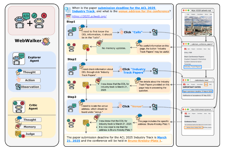 - 提出了 WebWalker,多智能体框架,通过探索-评价范式模拟类似人类的网络导航。