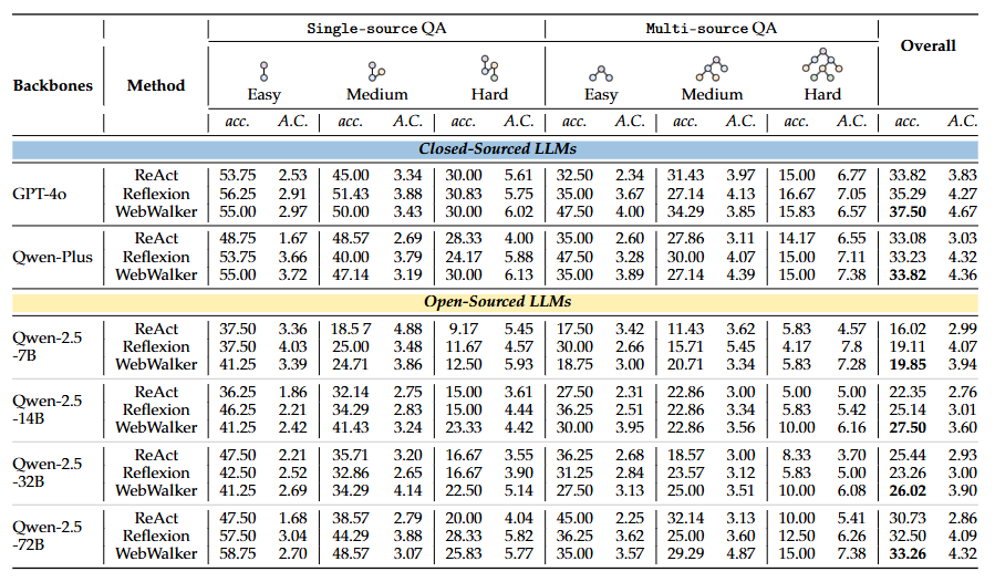- 引入 WebWalkerQA,用于评估 LLMs 网络遍历能力的基准。评估 LLMs 遍历网站子页面以系统提取高质量数据的能力。